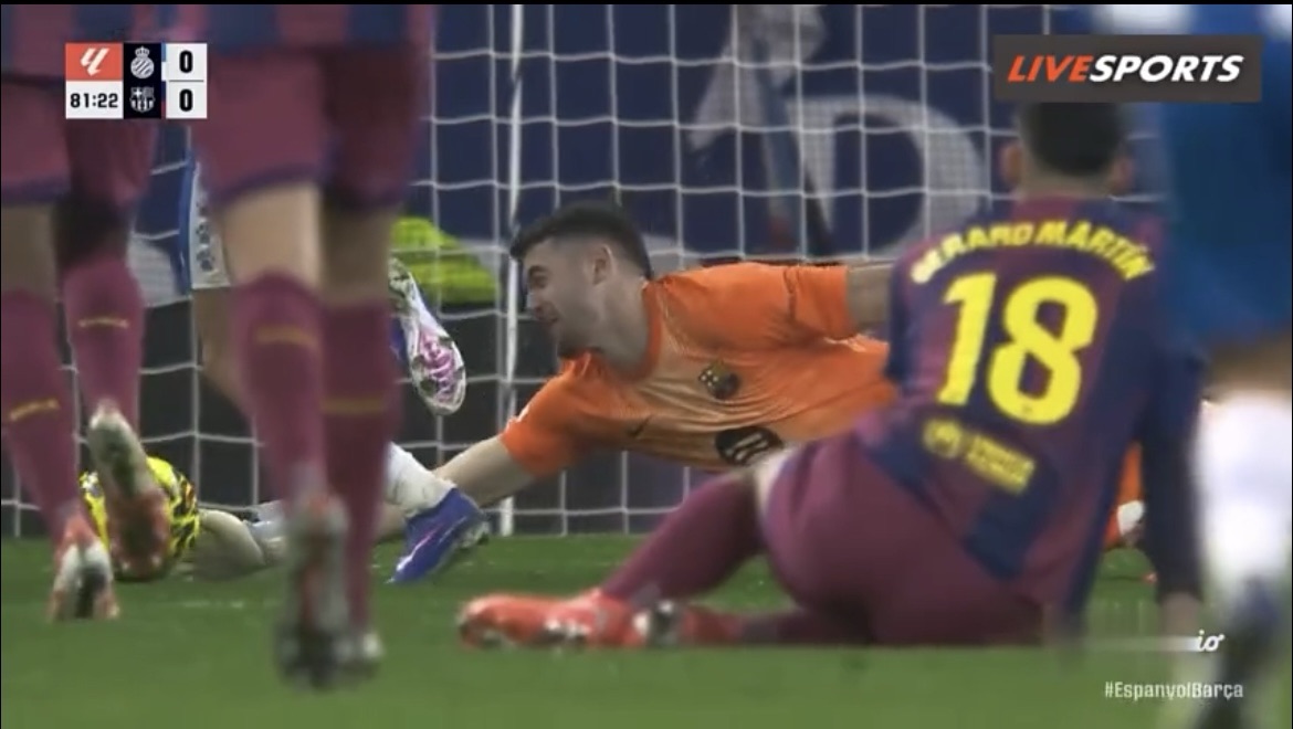 The decisive moment came when Espanyol broke through Barcelona’s defensive line, sending their forward clean through on goal. With time to set himself, the striker looked certain to score, but Garcia showed outstanding composure and reflexes. Staying big and reading the attacker’s intention perfectly, the Barcelona keeper spread himself and blocked the effort at point-blank range.