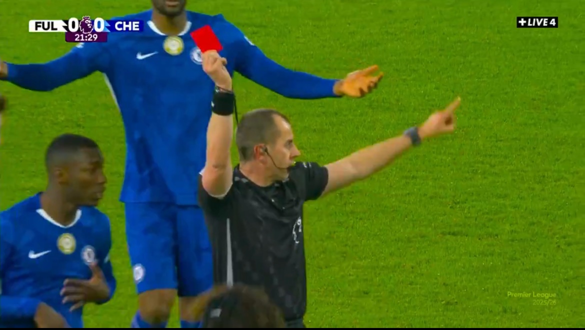 The decision instantly sparked chaos on the pitch. Chelsea players surrounded the referee in disbelief, while the Stamford Bridge crowd erupted in protest. Replays showed minimal contact, with no clear evidence of violent conduct or a denial of an obvious goal-scoring opportunity that would justify such a severe punishment.